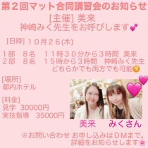 🌸第二回 関東 マット合同講習会のお知らせ ソープ講習師、マットヘルス・マット講習風俗講習師、風俗カウンセラーの美来です美来&神崎みく先生主催第二回 関東 マット合同講習会🌸美来主催神崎みく先生をお呼びします💕【日時】10月26(木)1部 美来のマット11時30分〜14時30分2部 みくさんのマット ... 2023/08/21 | 合同講習