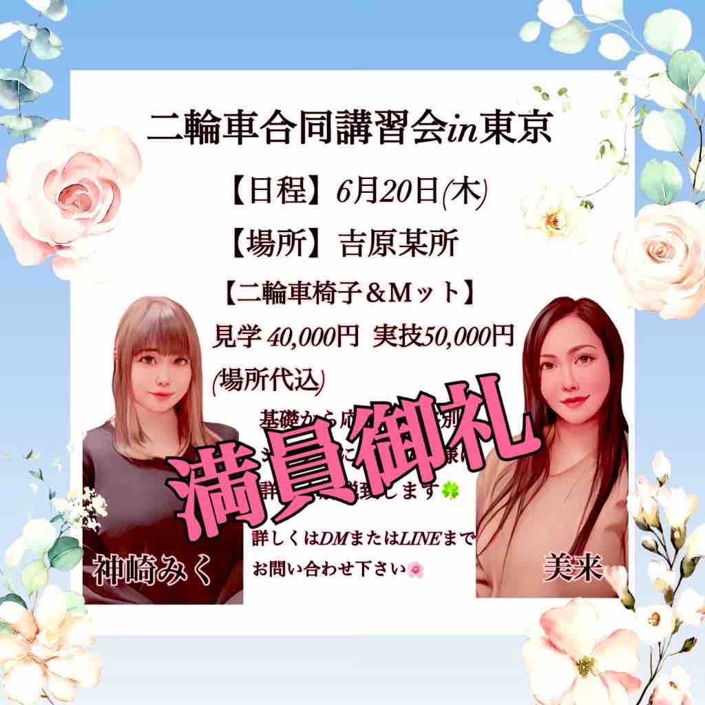 🌸第4回 業界初 関東二輪車合同講習会 2024/04/14 00:47 ソープ講習師、マットヘルス講習風俗講習師、風俗カウンセラーの美来です6/20(木)吉原にて業界初 二輪車合同講習会を開催します🌸二輪車しない方や見学だけでもご参加🆗ソロでも役立つ内容もやります。すみません。このブログに載せる前に別のサイトでの募集から受付終了になってしまいました💦次回は椅子特化型合同講習会を9/19(木)関西(福原)11/21(木)東京🗼で開催します🍁ご興味有る方は是非ご参加下さい🛁 「合同講習」カテゴリの最新記事 < 前の記事次の記事 > コメント コメントフォーム 名前 コメント 記事の評価 リセット リセット 顔 星 情報を記憶 コメントを投稿する